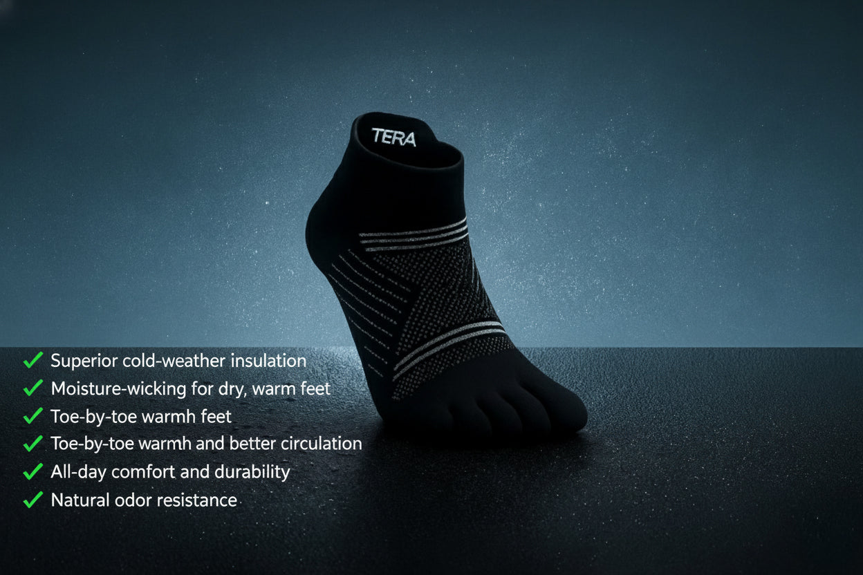 Made with a custom Merino wool blend, the TERA Thermal Toe Socks keep your feet warm, dry, and supported through any winter activity.